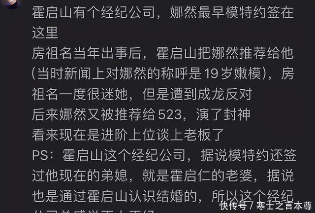 知情人士还透露,霍启山有一个经纪公司,娜然最早的模特约便签在这家公司。当年房祖名出事后,霍启山便把当年才19岁的娜然介绍给房祖名,房祖名也一度很迷恋娜然,两人还被媒体拍到深夜聚会。只可惜这段感情因为成龙的竭力反对而告终了,之后霍启山又将娜然介绍给乌尔善,演了《封神》之后才进阶上位和霍启山走到一起。