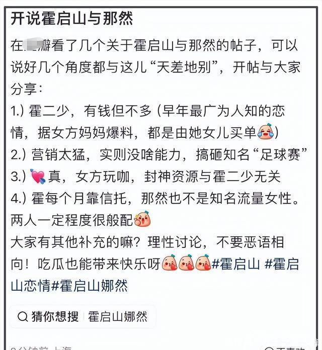 网友继续深扒,发现两人早就有交集了。知情人士透露,娜然每个月都定期要去香港。而一位自称是娜然的粉丝则透露,女方是恋爱脑,和霍启山在一起已经4年了。